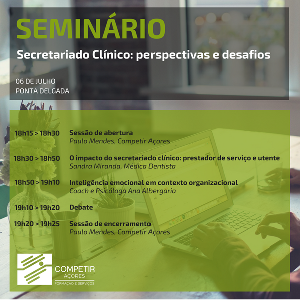 Ao longo do curso temos reservado alguns momentos extra programa para partilhar informações/ferramentas com os formandos que, no nosso entender, poderão contribuir positivamente neste processo de valorização profissional. Neste contexto, a Competir Açores irá realizar o Seminário “Secretariado Clínico: perspetivas e desafios”, a acontecer no dia 06 de julho, das 18h15 às 19h25 nas instalações […]